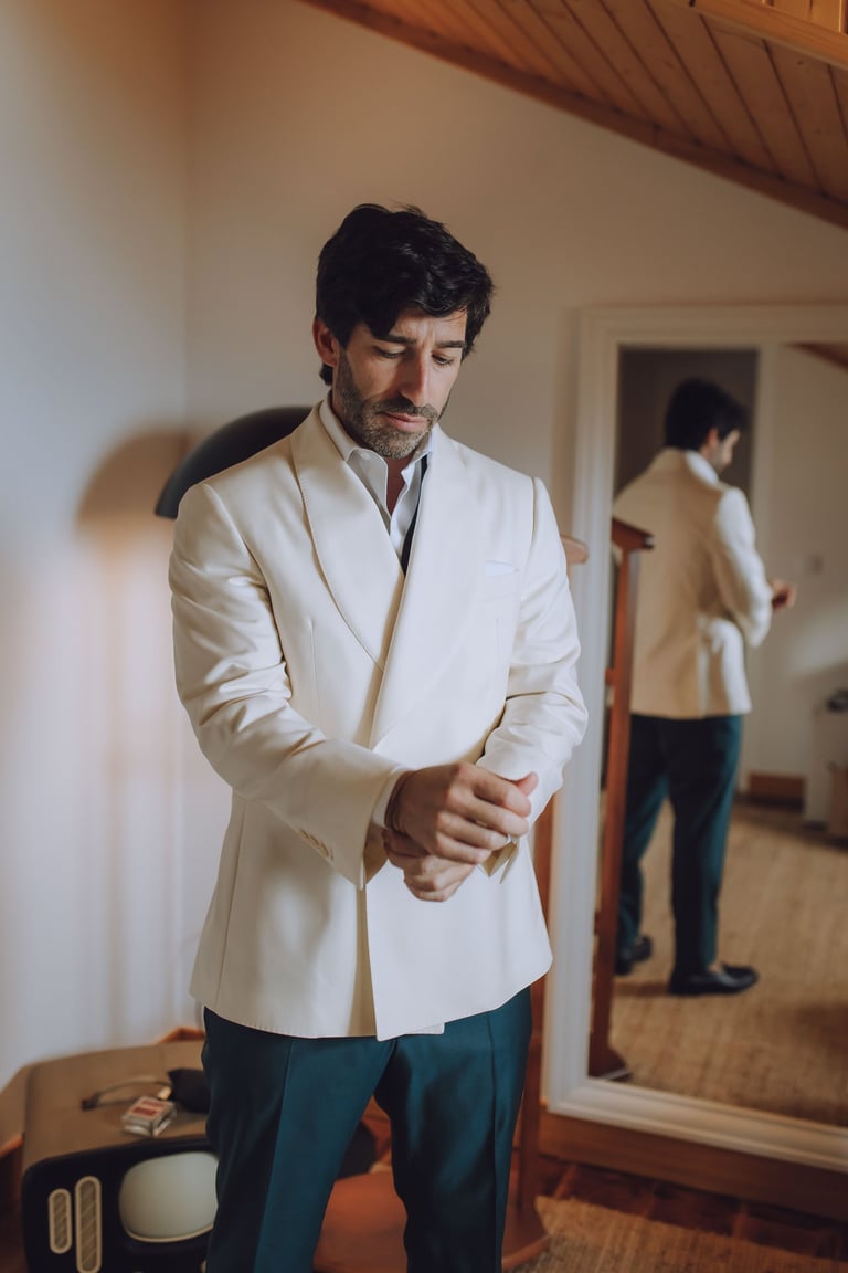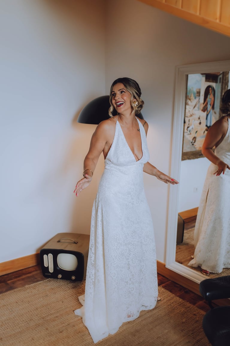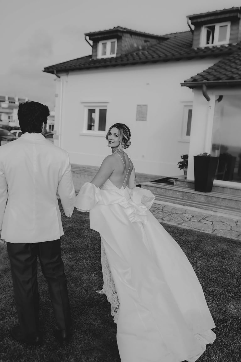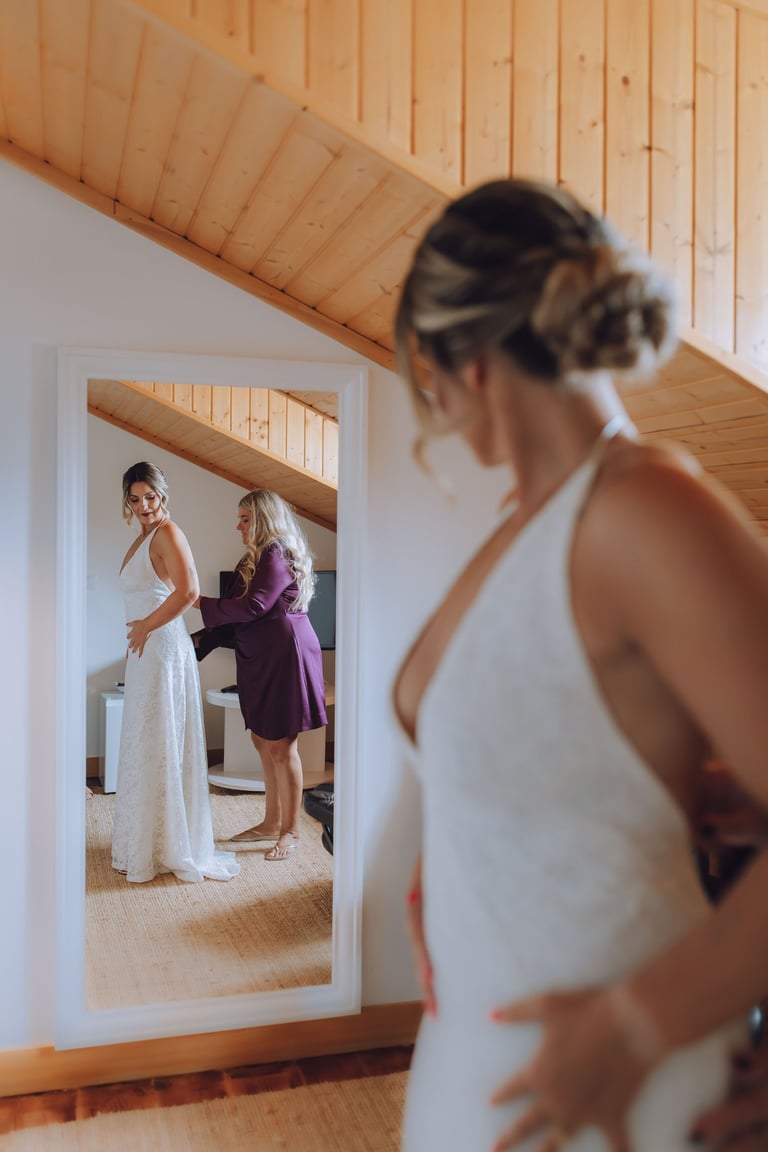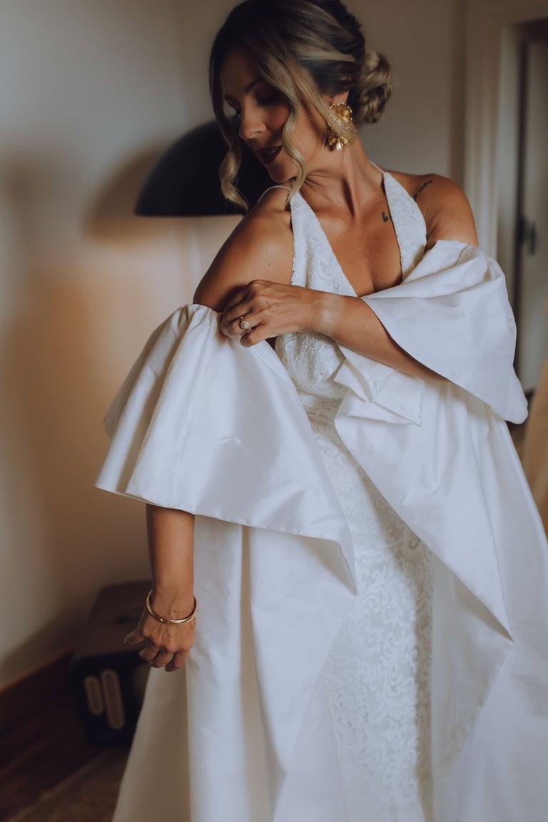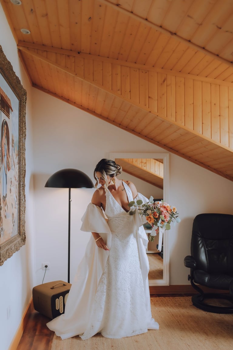 A preparação da Sara foi um momento tão especial quanto o próprio casamento. Com a sua mãe, Mónica, estilista e criadora de vestidos de noiva por medida, Sara vestiu um sonho feito à mão, desenhado com amor e cuidado. Cada detalhe do vestido refletia não apenas a visão criativa de Mónica, mas também a personalidade da filha: elegante, delicada e cheia de presença.
