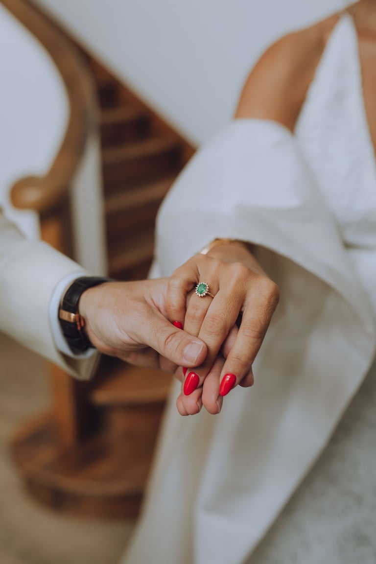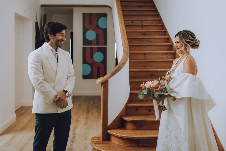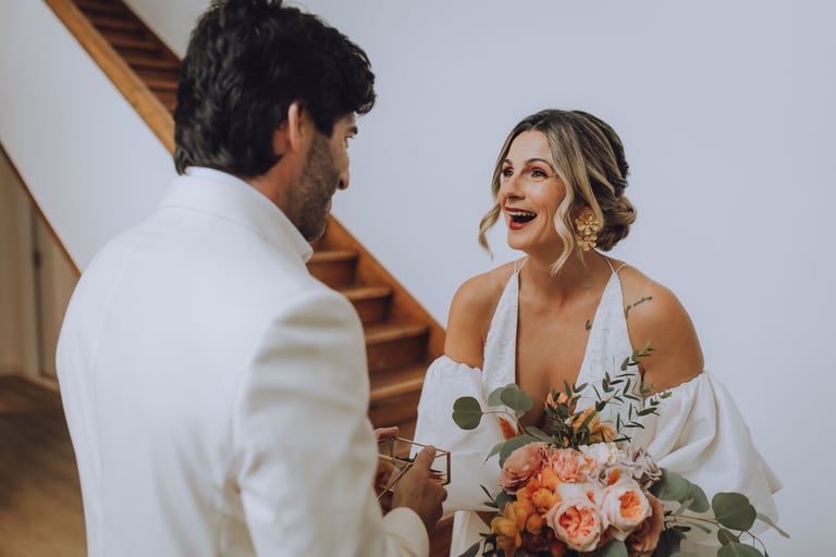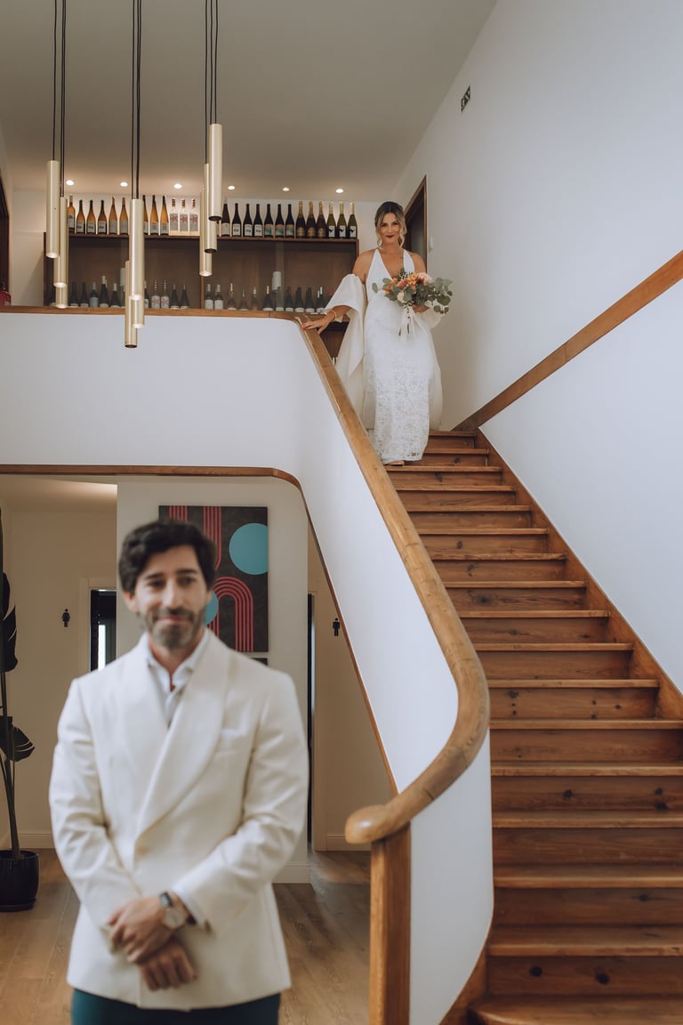 O momento do first look foi mágico e cheio de emoção. Num instante de cumplicidade, Sara e João viram-se de noivos pela primeira vez naquele dia especial. João surpreendeu Sara com um anel de pedra verde, e o olhar dela, entre surpresa e ternura, transformou aquele encontro num instante inesquecível, repleto de amor e significado.