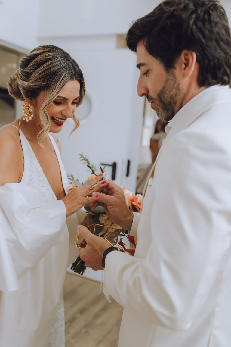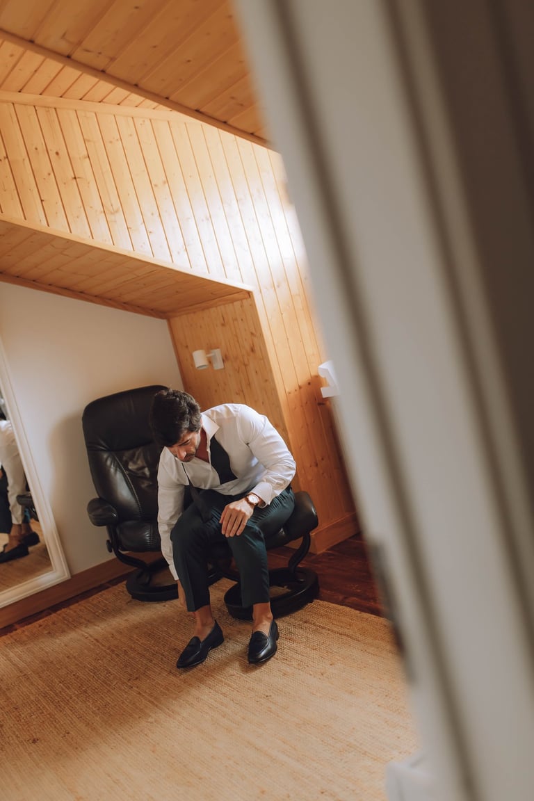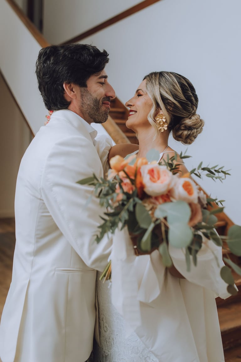 Com um número reduzido de convidados, escolheram viver cada momento com calma e intenção. Os preparativos aconteceram no próprio espaço, entre olhares cúmplices e uma tranquilidade rara, que se manteve ao longo de todo o dia. A cerimónia, simples e significativa, refletiu exatamente aquilo que são, sem excessos, mas profundamente verdadeira.