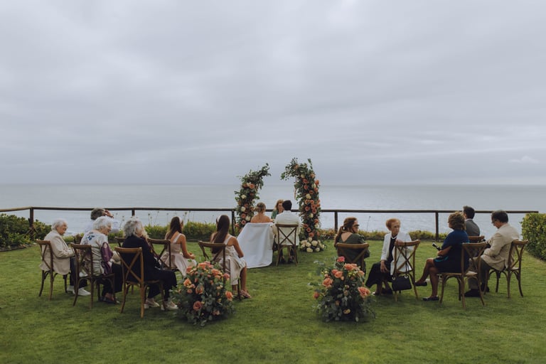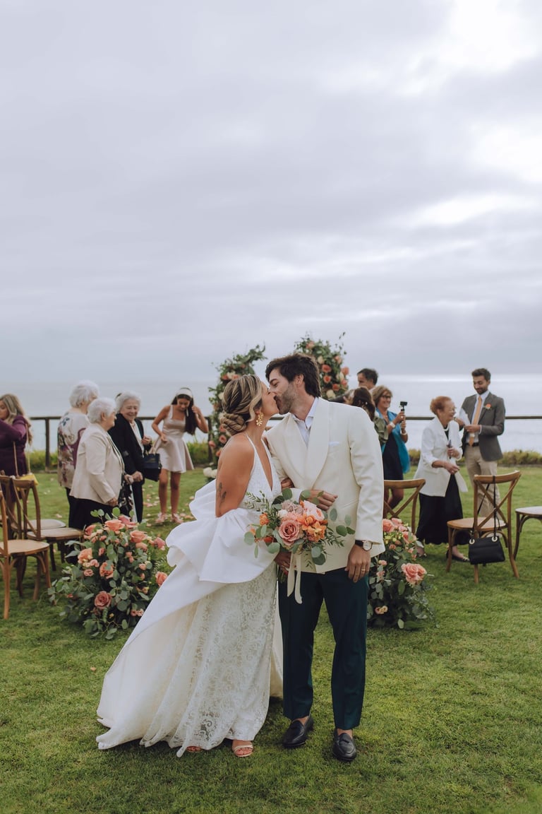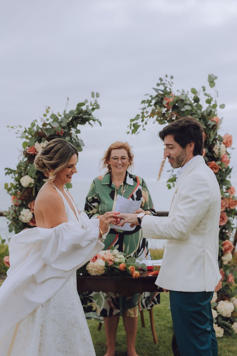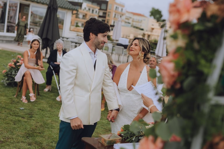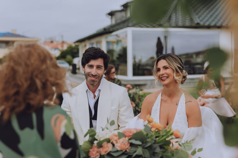 A cerimónia aconteceu com vista mar, com o som das ondas a acompanhar cada gesto. Sara e João trocaram votos rodeados pelos familiares mais próximos, enquanto as flores cuidadosamente preparadas pela Aroma do Campo Florista enchiam o espaço de cor, aroma e delicadeza. A leveza do vento, a luz suave do dia e o perfume das flores tornaram cada detalhe ainda mais memorável, criando uma celebração íntima, genuína e cheia de significado.
