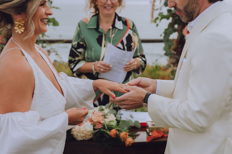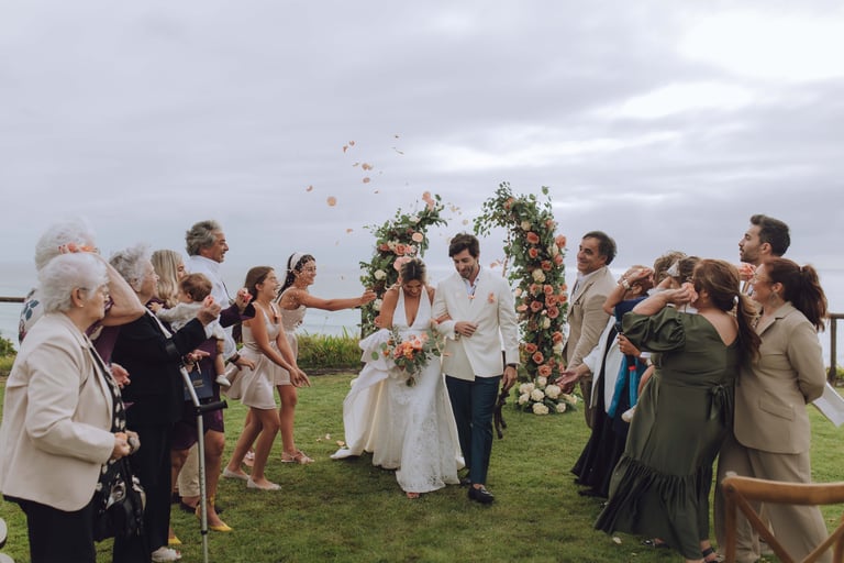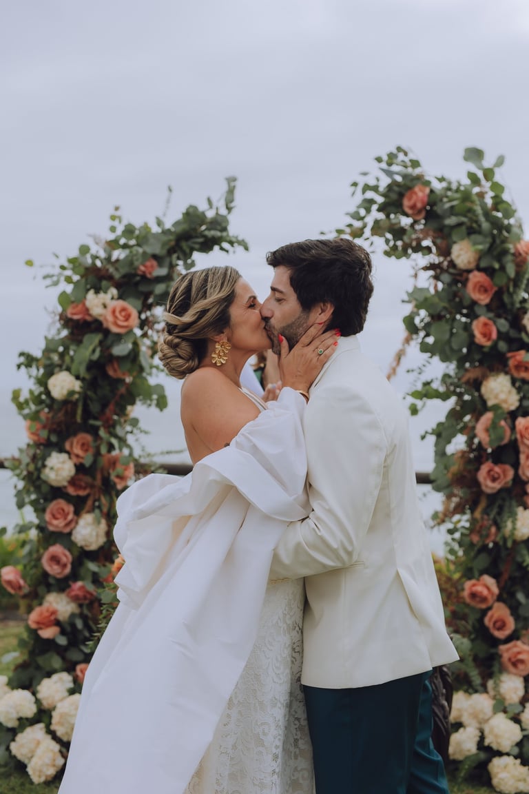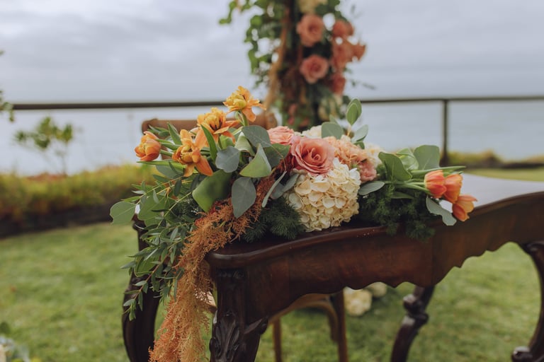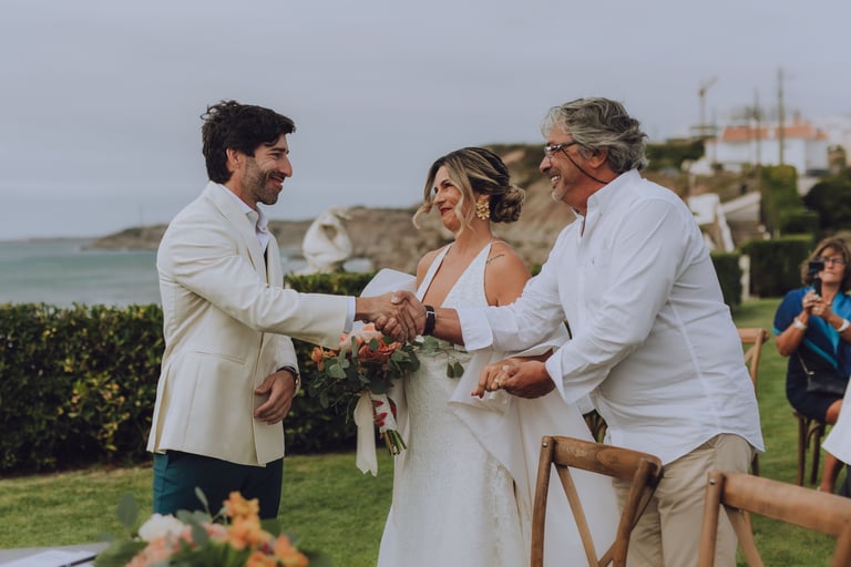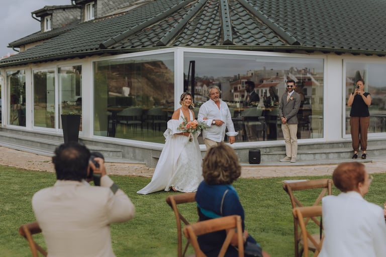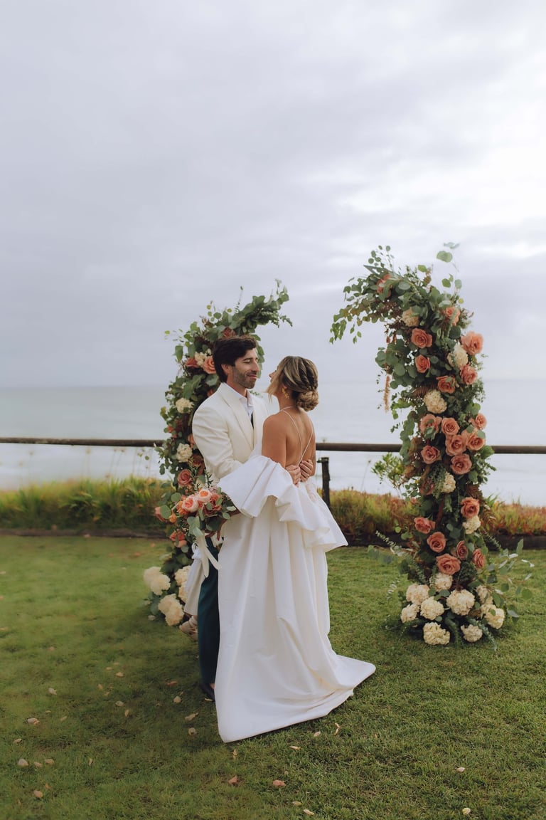 A cerimónia aconteceu com vista mar, com o som das ondas a acompanhar cada gesto. Sara e João trocaram votos rodeados pelos familiares mais próximos, enquanto as flores cuidadosamente preparadas pela Aroma do Campo Florista enchiam o espaço de cor, aroma e delicadeza. A leveza do vento, a luz suave do dia e o perfume das flores tornaram cada detalhe ainda mais memorável, criando uma celebração íntima, genuína e cheia de significado.