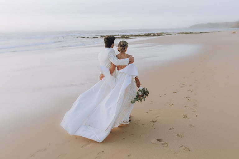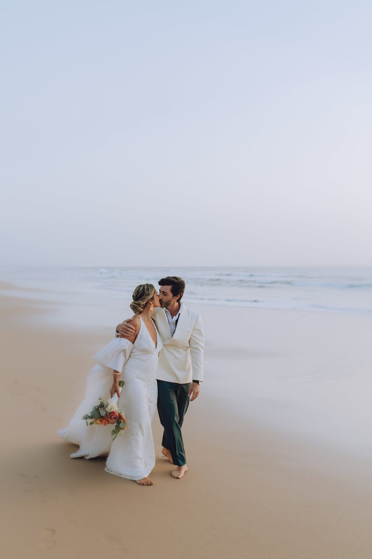 Sara e João desceram até à praia para um momento só deles. De pés descalços na areia, a luz de final do dia e o som tranquilo das ondas, caminharam de mãos dadas, riram, trocaram olhares e criaram memórias leves e genuínas, refletindo a intimidade e a cumplicidade que definem a sua história de amor.